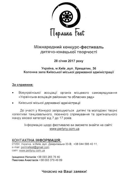 28 січня 2017 року відбудеться Міжнародний конкурс-фестиваль дитячо-юнацької творчості «Перлина Fest».