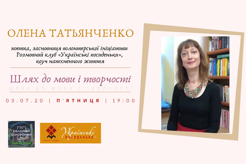 3 липня о 19:00 - онлайн-зустріч із громадською діячкою, поеткою, засновницею волонтерської ініціативи Розмовний клуб «Українські посиденьки», коучем натхненного життя, магістркою управління міжнародним бізнесом (США, Монтерей, Каліфорнія) - Оленою Татьянченко.