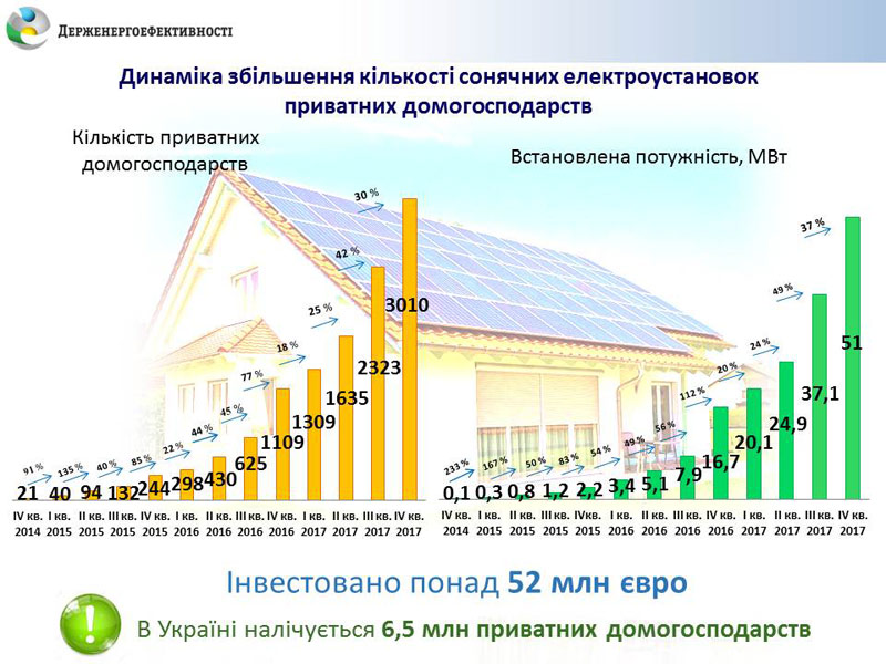 «Стрімкий попит населення на «сонячну» електроенергію пояснюється прийнятим у 2015 р. Законом України № 514-VIII (http://zakon5.rada.gov.ua/laws/show/514-19), яким надано вигідний «зелений» тариф із прив’язкою до курсу євро. Це означає, що домогосподарство може продавати надлишок згенерованої «чистої» електроенергії в мережу і швидко повертати кошти, вкладені у сонячні панелі без застережень щодо інфляції», - зауважив Голова Держенергоефективності Сергій Савчук.