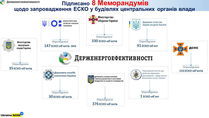Також оголошено 17 ЕСКО-тендерів щодо об’єктів Міносвіти (КНУ ім. Т.Шевченка, Університету харчових технологій, КПІ ім. Сікорського та Національного авіаційного університету) та 11 тендерів щодо об’єктів Держстату.
