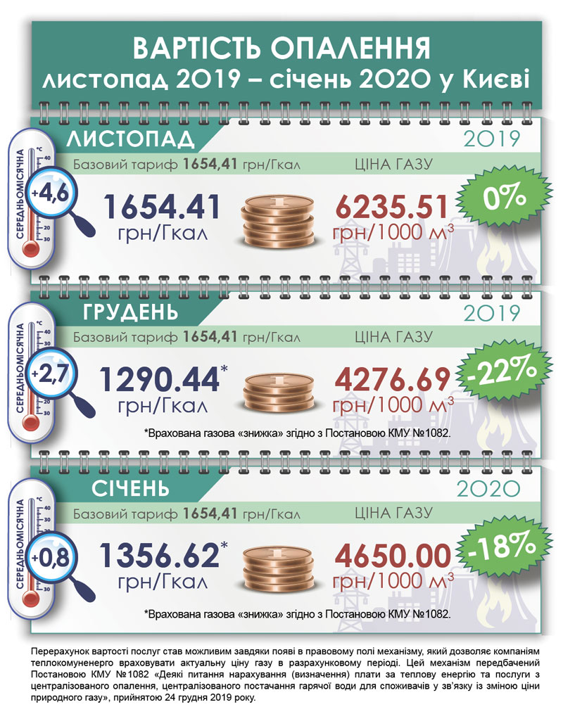 «Вартість 1 Гкал тепла в січні 2020 року порівняно з базовою (тарифною) вартістю нижча майже на 300 грн і становить 1356,62 грн/Гкал. Це на 18% нижче базового тарифу, затвердженого на опалювальний сезон 2019/2020. При нарахуваннях за тепло враховується середньомісячна температура, визначена Укргідрометцентром. Зокрема, середньомісячна температура в січні 2020 року на 2 градуси нижча, ніж у грудні 2019 року. Відповідно збільшилися обсяги споживання тепла будинками, і це вплинуло на суми в платіжках. Газова «знижка» на опалення в грудні 2019 року становила 22%, а в січні 2020 року – 18% (вартість газу змінилась)».