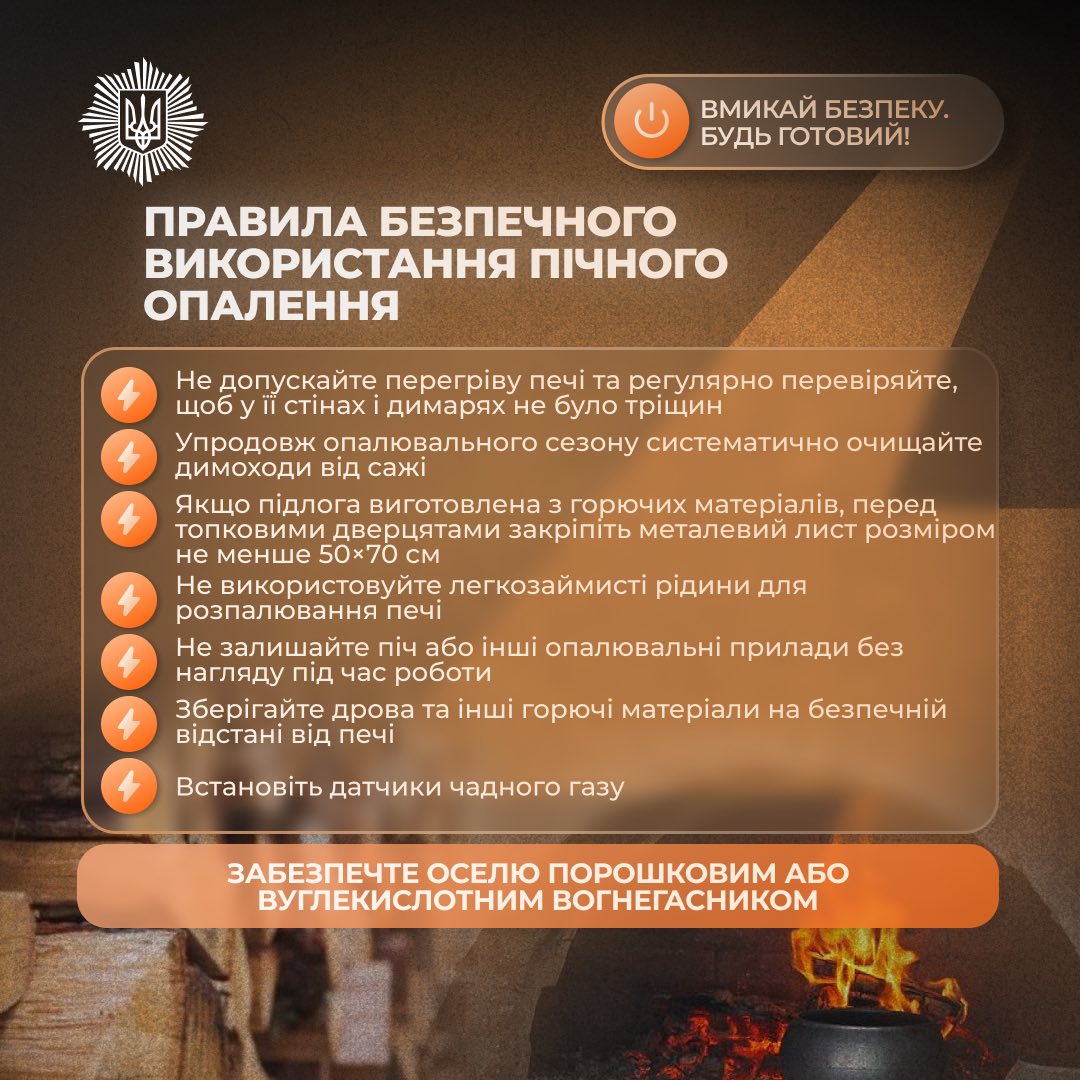 Під час використання пічного опалення не допускайте перегріву, регулярно очищайте димоходи та не залишайте вогонь без нагляду.