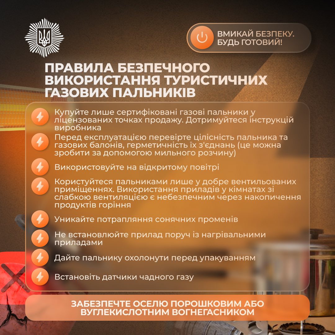 Туристичні газові пальники та балони мають бути справними й сертифікованими. Користуватися ними слід на відкритому повітрі або в добре провітрюваних приміщеннях.