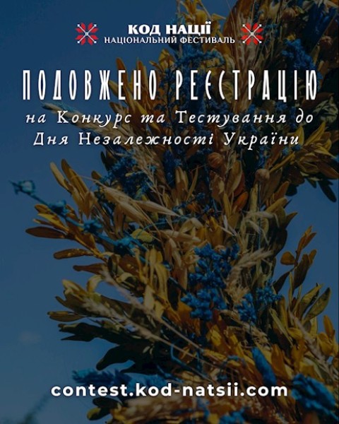 Повідомляємо, що згідно з рішенням організаторів подовжено подачу заявок на Конкурс на сайті: https://contest.kod-natsii.com/ по 31.08, оцінювання творчих проєктів по 04.09, а оголошення переможців Конкурсу відбудеться 5 вересня на офіційних сторінках Фестивалю в соціальних мережах.