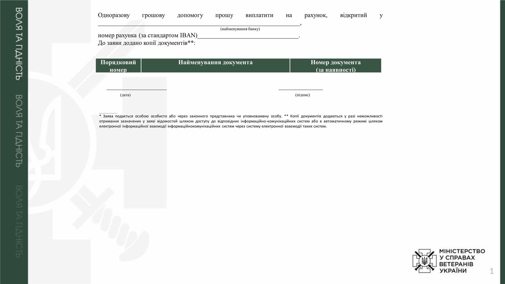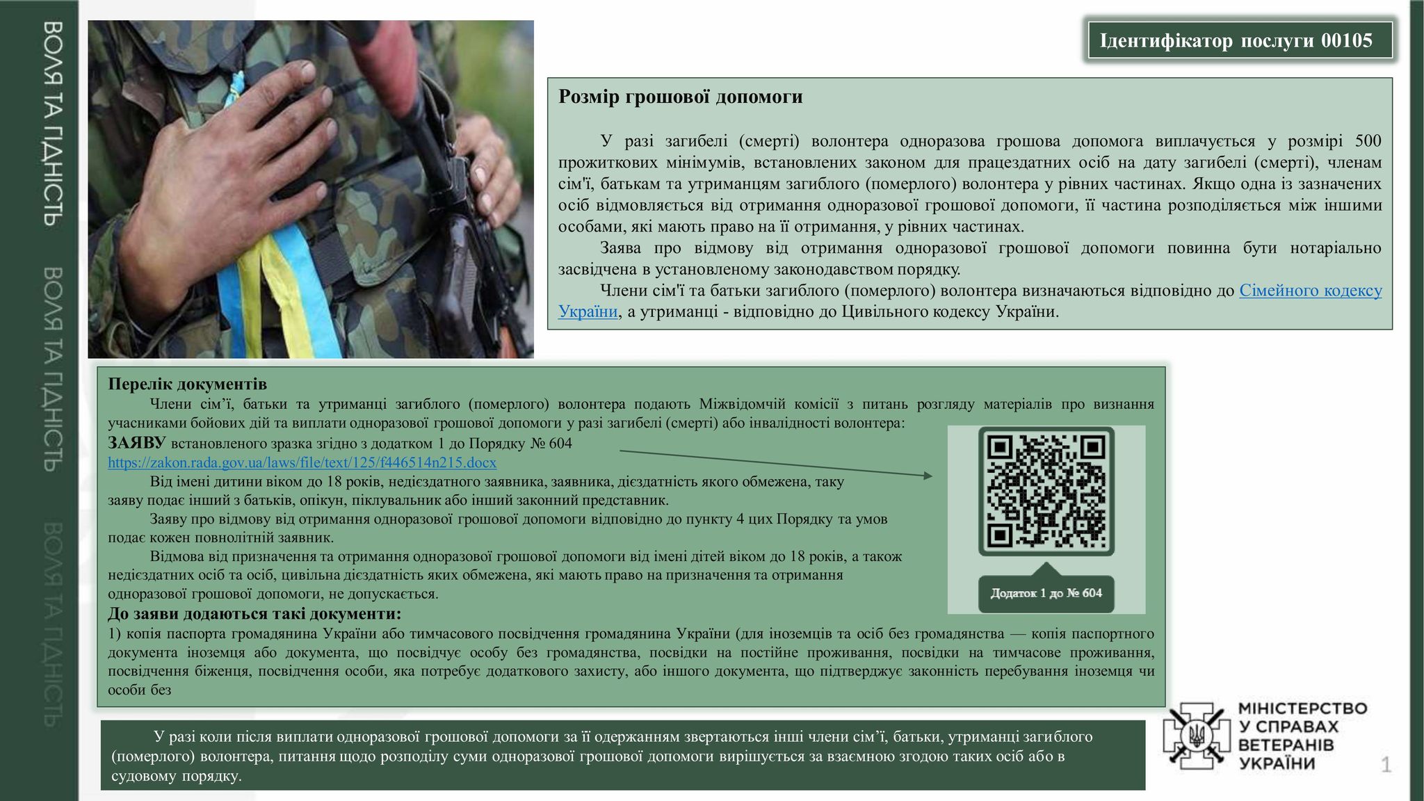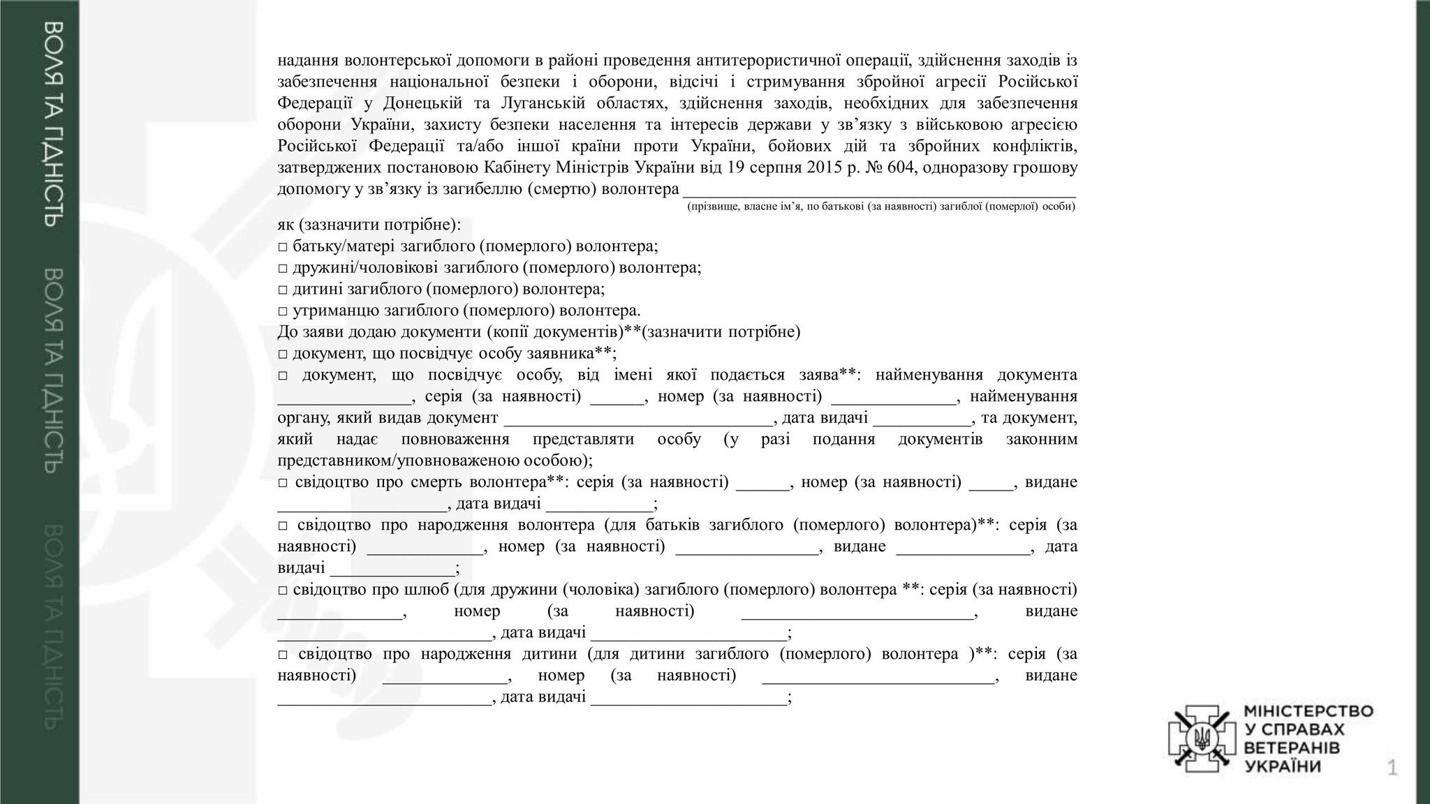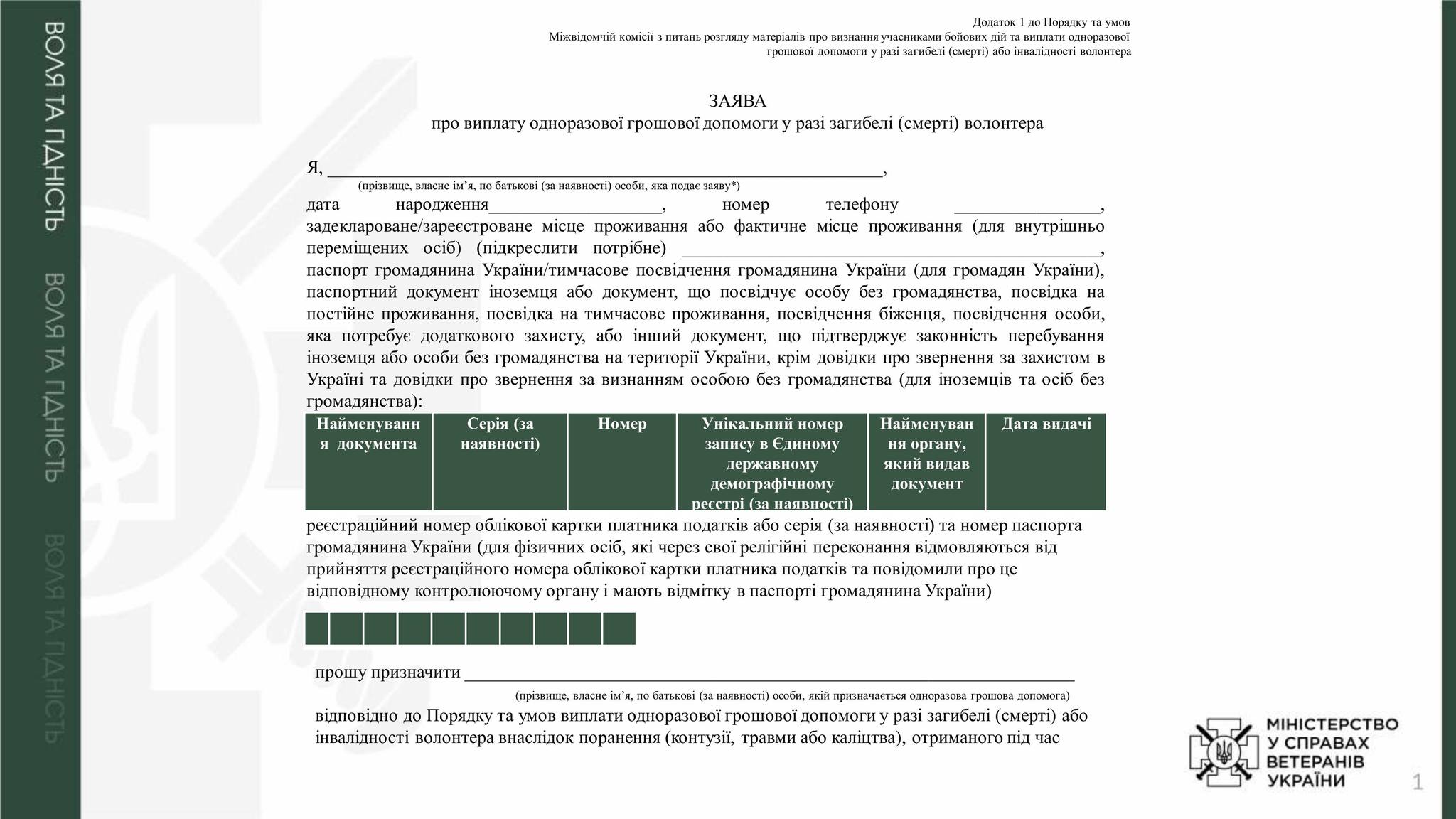 Як отримати одноразову грошову допомогу членам сім’ї, батькам та утриманцям волонтера, загиблого (померлого) внаслідок поранення, отриманого під час надання волонтерської допомоги?