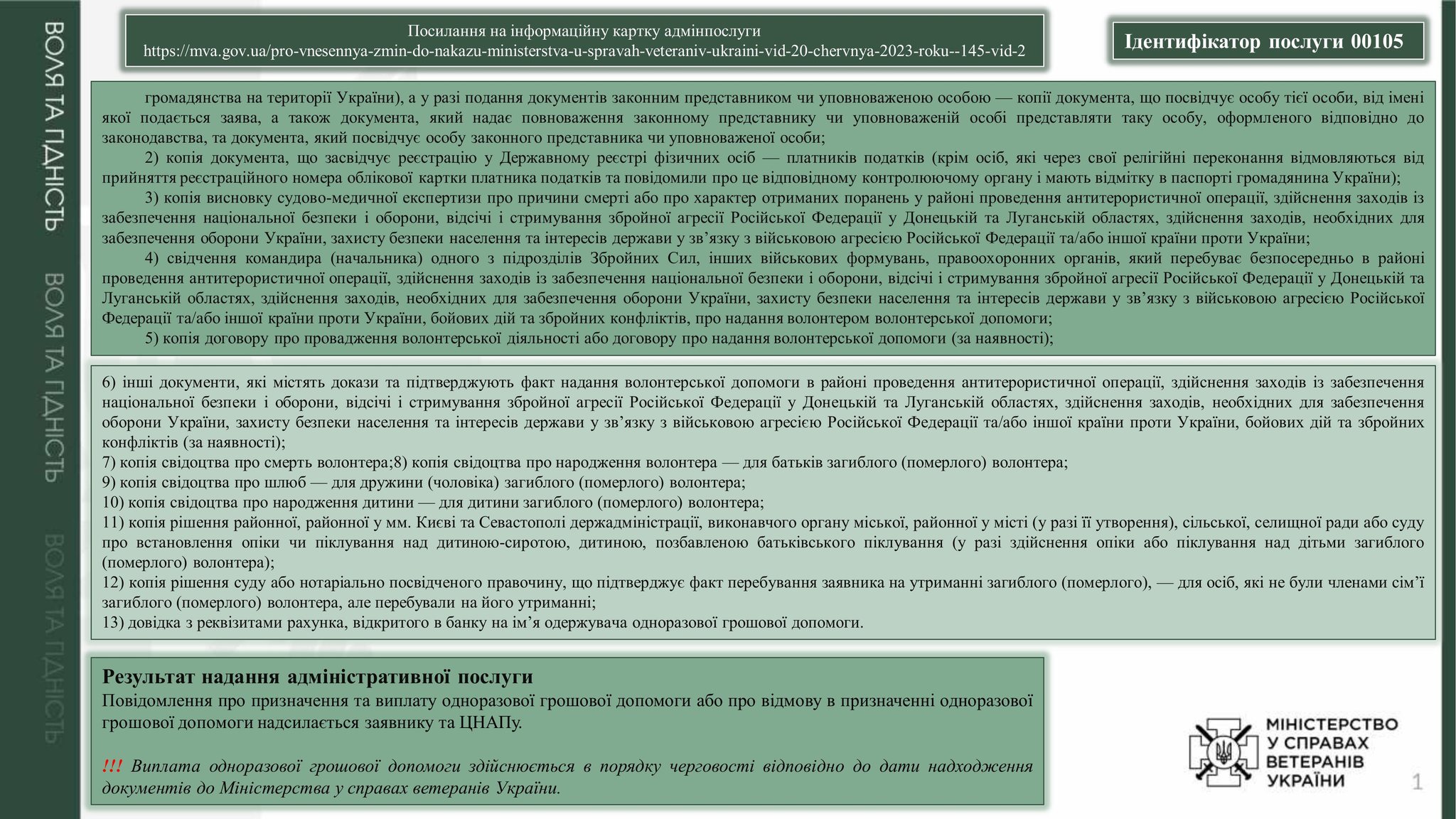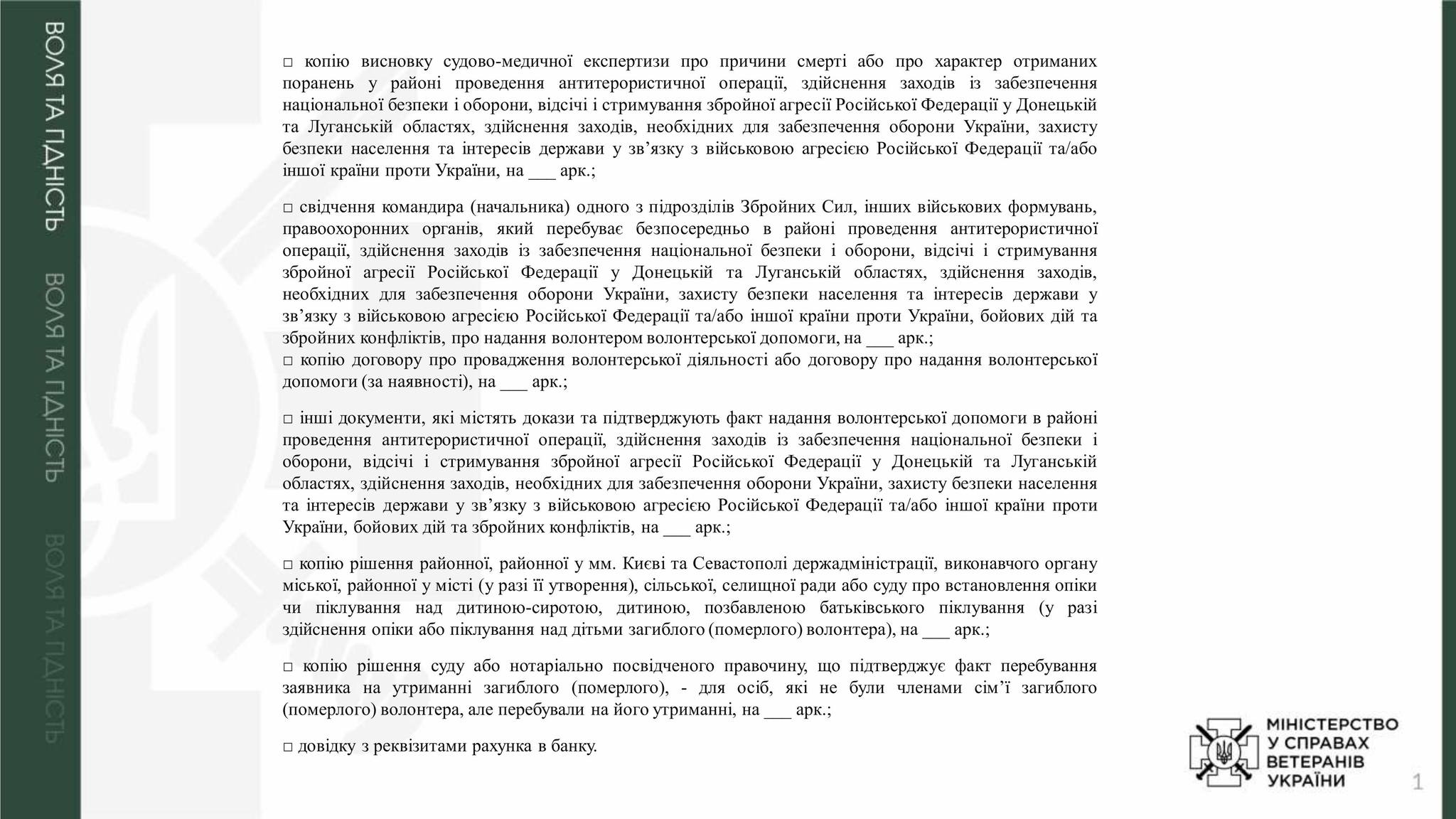 Як отримати одноразову грошову допомогу членам сім’ї, батькам та утриманцям волонтера, загиблого (померлого) внаслідок поранення (контузії, травми або каліцтва), отриманого під час надання волонтерської допомоги в районі проведення антитерористичної операції, здійснення заходів із забезпечення національної безпеки і оборони, відсічі і стримування збройної агресії Російської Федерації у Донецькій та Луганській областях, здійснення заходів, необхідних для забезпечення