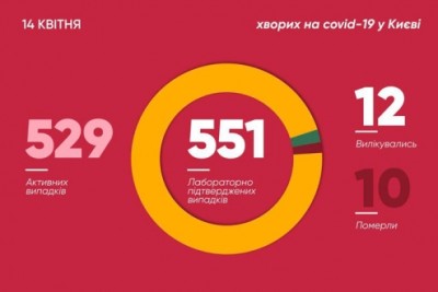 «Кількість киян, у яких лабораторно підтвердили захворювання на коронавірус, збільшилася за минулу добу ще на 56 людей. З них 5 медиків. За добу, що минула, в столиці, на жаль, ще 1 летальний випадок. Загалом у Києві вже 551 підтверджений випадок захворювання на COVID-19», – наголосив Віталій Кличко.
